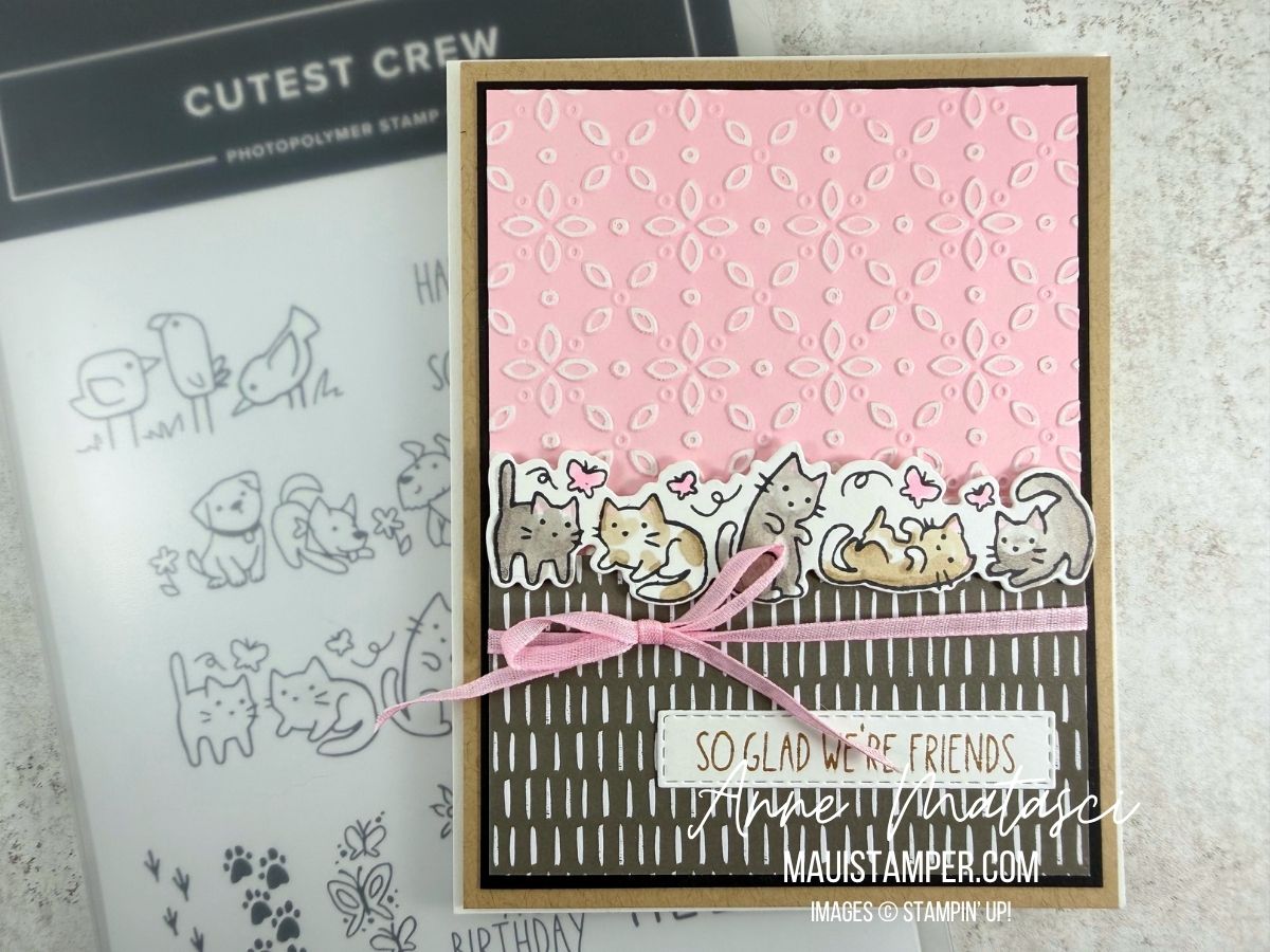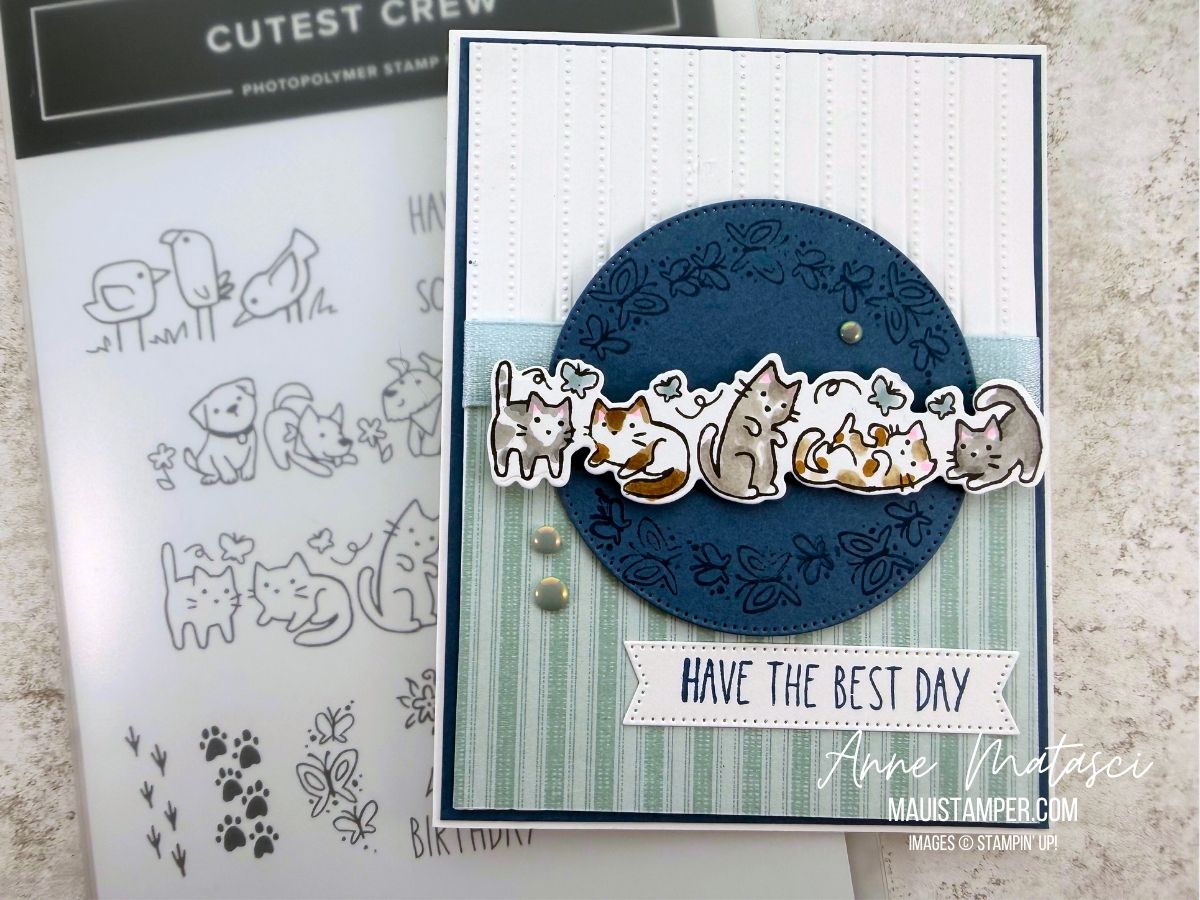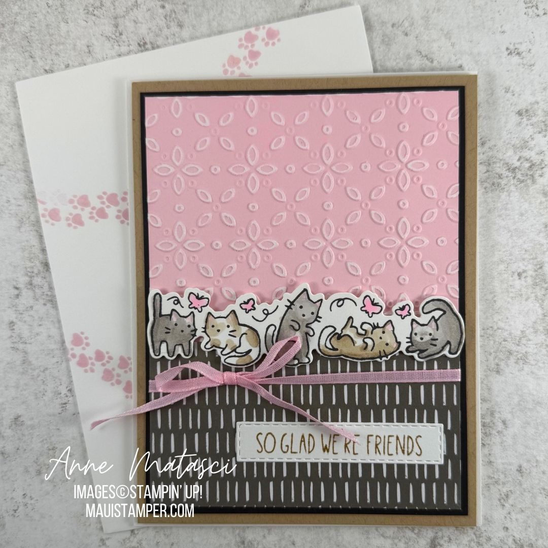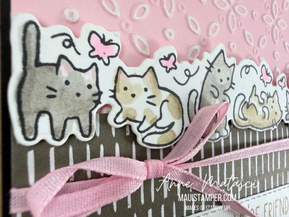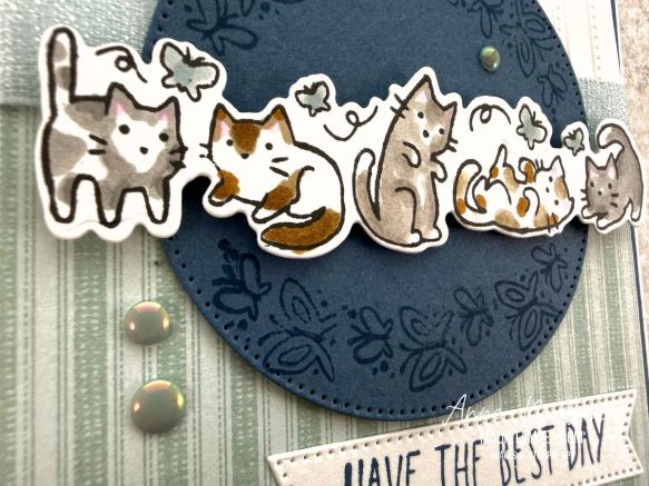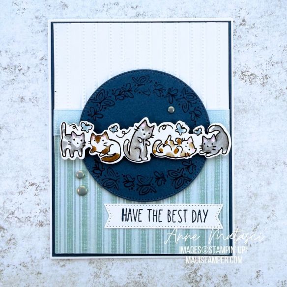 I love the patterns of lines, both horizontal and vertical, anchored by the Misty Moonlight circle in the middle. The patterns in the embossing folder lined up almost perfectly with the Designer Series Paper – what a lucky coincidence! Oh, and have I mentioned the kittens??? 😉