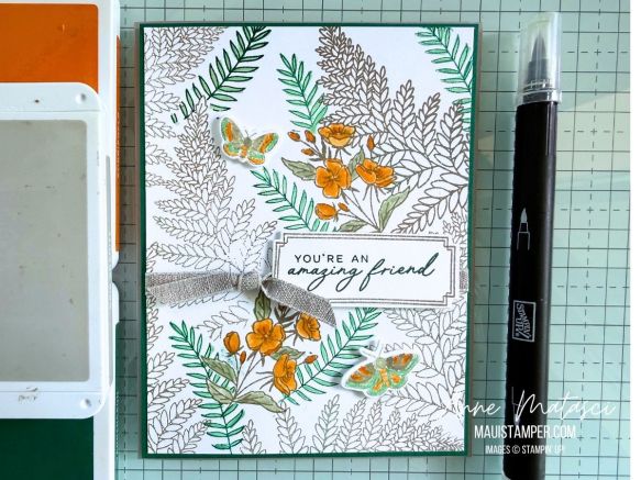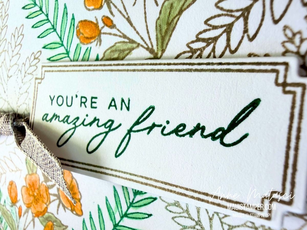 I lined up the flower outlines, then added the color fill. I stamped off the Old Olive for the leaves to keep it soft and balanced with the Cloud Cover. I’m sorry to say the Fabulous Sayings Product of the Month has sold out – don’t wait on these products, their supply is not guaranteed!