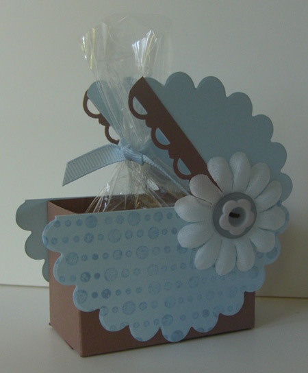 The scallop circles are adhered to a “2-4-6-8” box with the dimensions adjusted to 1.25 x 2.5.  Four Hershey kisses are squeezed into a Cello bag that fits perfectly into the box.  It was a little bit of work, but well worth it for a sweet baby and mama.