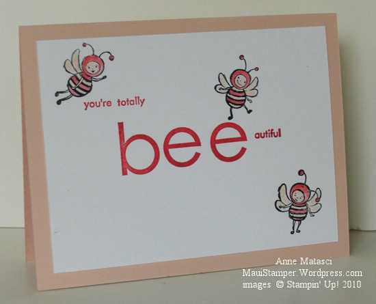 Last month, the Hostess for my stamp club brought fabulous treats – a gorgeous cheese and fruit platter, delicious crackers, and a special champagne. No, this wasn’t Auntie’s fabulous home-made Cherry and Lilikoi wine – Auntie might have blushed. This was a special bubbly and we laughed and laughed over the label. Not to disparage the product, but let’s just say I’ve tasted better champagne. The label was, well, quite unusual. This week I finally got the card made: