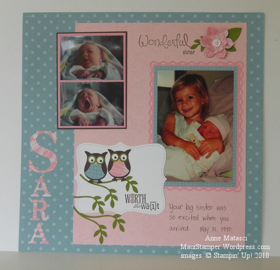 The two beautiful little girls in this photo are big grown up girls now.  I was inspired to put this page together when I created a card with a similar theme, and I spent a wonderful afternoon sorting through old photos.  It’s so much easier for me to choose pictures when this much time has gone by.  I don’t have the same emotional attachment to every single event I thought was worthy of documenting and it’s easier to edit and choose the memories that really stand out.