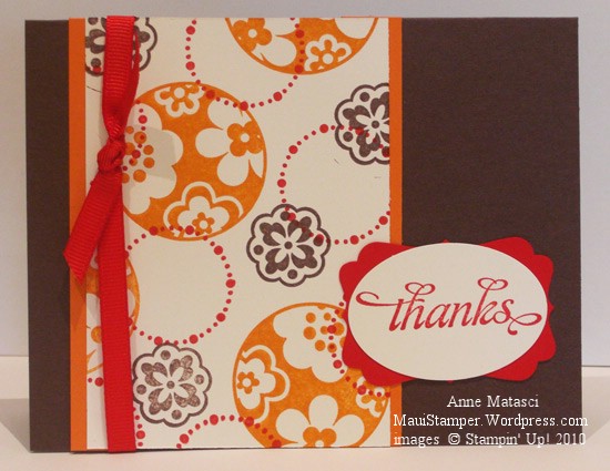 This is a simple concept that could be re-interpreted in many different ways, but I thought the colors were very Autumnal, and I’ve said before that changing the colors of my paper is as close to Autumn as I get here in the islands. You could even take a full sheet (8 1/2 x 11 inches) of Very Vanilla cardstock and do your random stamping all over that, then cut it into card pieces. Sometimes it’s all about efficiency!