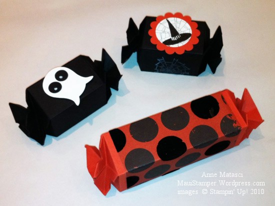 Kellie was here this week and shared these fabulous Halloween treat holders. She told me that she made over 30 of them with her mom and her daughter for her daughter to share at school, and they had a great time together. Her mom commented that the 9 year old recipients might not appreciate all the time and effort that went into the making, but her daughter responded “But I’m having a GREAT time!!” Doesn’t that make your heart melt?