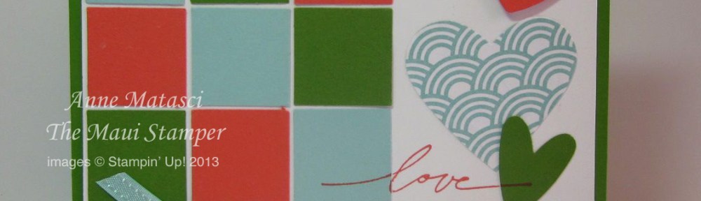 Lately I’ve been CASEing sketches, trying to jump start my creativity and move a little bit out of my comfort zone. This sketch comes from the cutting edge files of Mary Fish. It’s fun to play with a sketch, to update it with new colors and a little bit of your own personality. The colors I chose and the addition of the ribbon makes this card a little more feminine, but it’s still appropriate to give to a guy.