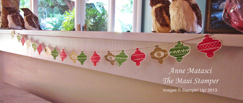 We are featuring two sets – Harvest of Thanks and the Christmas Ornament stamp and punch set. Here on Maui, while we are VERY VERY thankful, we don’t use a lot of the traditional harvest-associated images. Now, if Stampin’ Up! came up with a stamp set showing how sugar cane is harvested, or the line of pickers than go through a pineapple field, well, THAT would be a Harvest stamp set I could use!! But I digress…I am skipping ahead to Christmas.