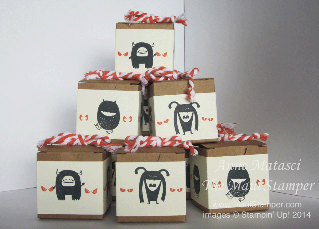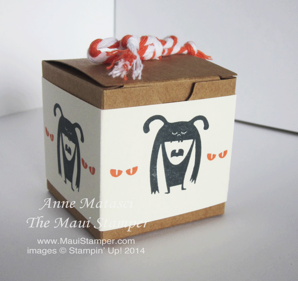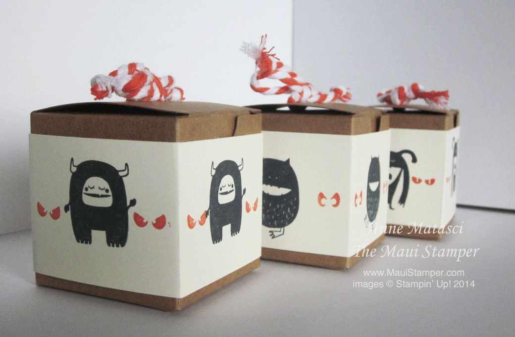The Tiny Treat boxes are 2″ all the way around – not too big and not too small. Just the right size for Halloween-sized chocolate!