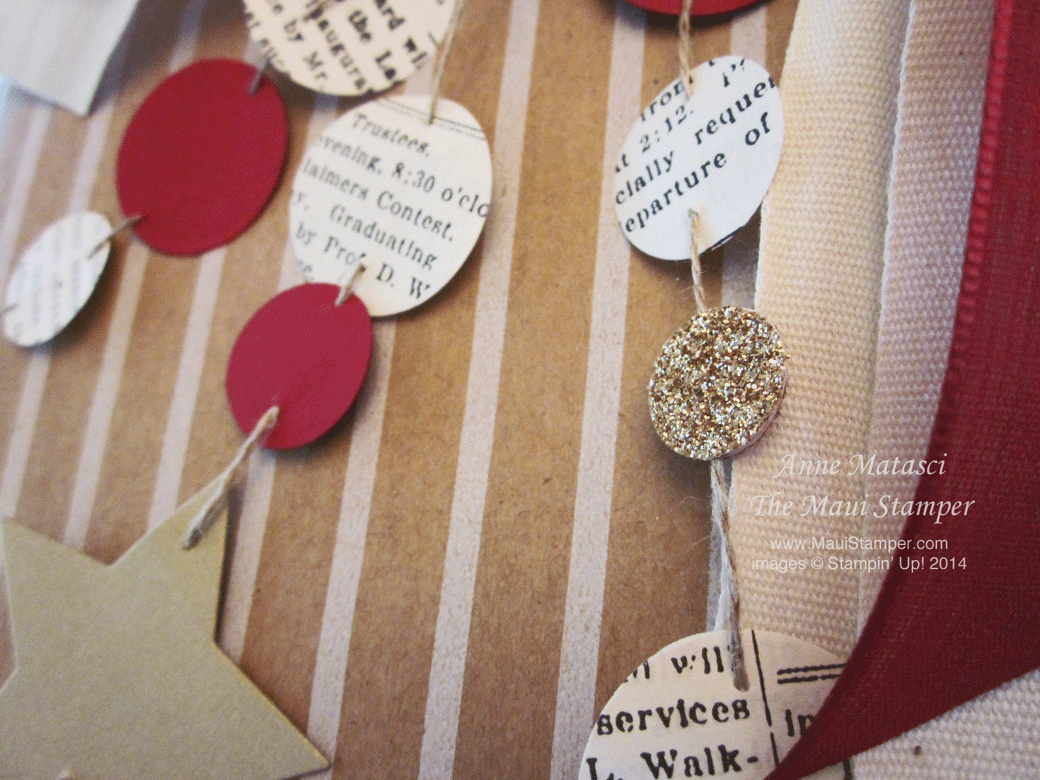 For a completely different look, I punched circles in Cherry Cobbler, Gold Glimmer, and Typeset Designer Series paper and strung them on Linen Thread. The Glimmer paper is attached with a glue dot, one on either side of the thread, so there’s lots of sparkle.
