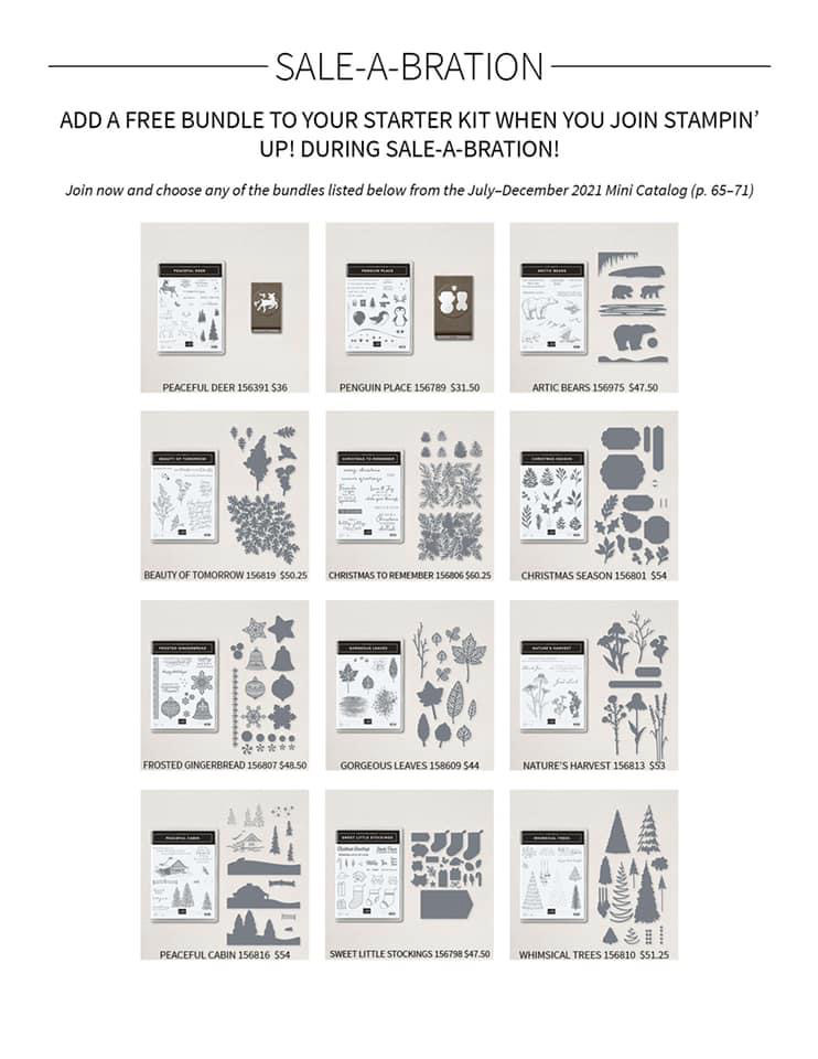 Have a big Wish List? Joining Stampin’ Up! is a great way to bring it all home – and you’ll enjoy all the benefits (discount, early access, exclusive events) plus during Sale-a-bration you can choose one of these bundles in addition to all the great products in your kit. $99, no tax, no shipping, no obligation to ever buy again. Contact me to chat about the possibilities, or visit my site to learn more. I promise no hard sell!! It has to be right for you.