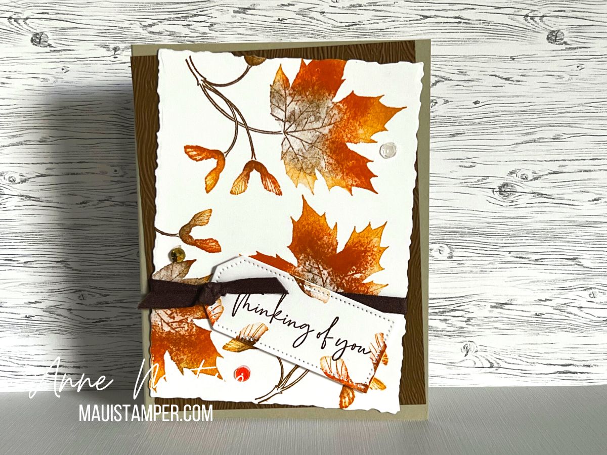 This is a variation on the baby wipe technique (add drops of ink to baby wipes) but the results are more vivid because you apply the ink directly to the stamp with a dauber. It’s an addictive process because each leaf turns out differently! I made half a dozen of these a couple of evenings ago and it was astonishingly therapeutic (well, all stamping is therapeutic).