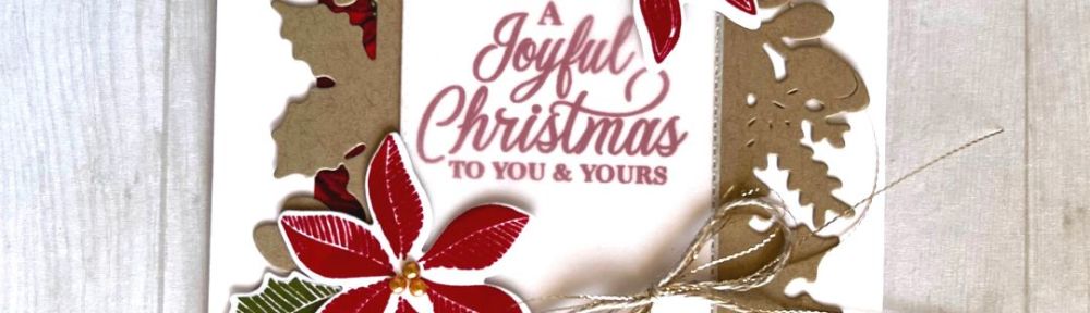 The intricate floral frame from the Merriest Frame dies sets the stage for a beautiful traditional card, complete with poinsettias and sparkle.