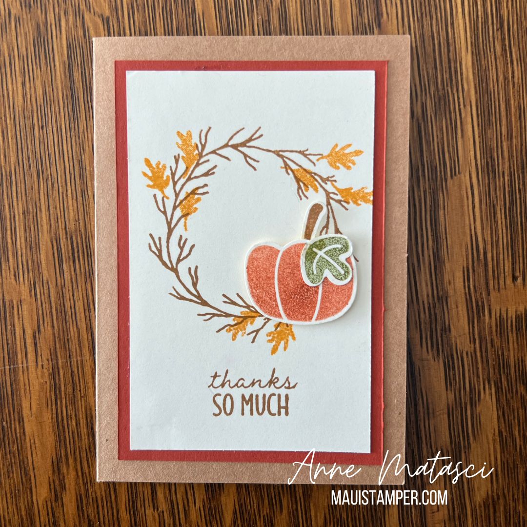 YUP. We’re still pickin’ in that patch! Today I’ve paired it with the Cottage Wreath stamps in a collaboration with my dear friend Crystal. We’re back to traditional pumpkin colors, and we used our Kraft Note Cards with Envelopes to make this a quick and easy card.
