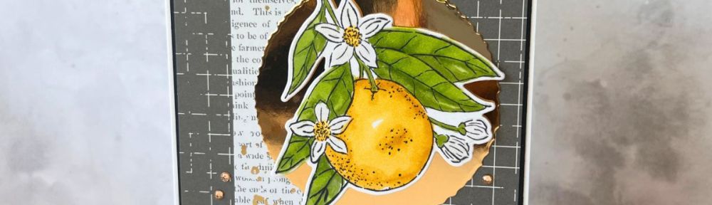 - Accessories: Stamp Cut and Emboss Machine, Deckle Circle Dies, Citrus Blooms Dies, Nature’s Sweetness DSP, Gold Foil Sheets, Adhesive Back Metallic Gems, Stampin’ Blends, Wink of Stella, Stampin’ Dimensionals