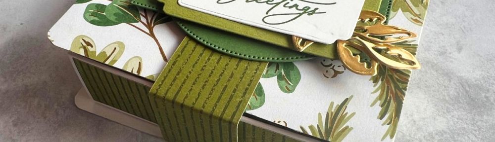 - Accessories: Book Treat Box, Stamp Cut and Emboss Machine, Greetings of the Season dies, Layers of Beauty dies, Something Fancy dies, Gold Foil Paper, Season of Green and Gold DSP, Gold Trim, Stampin’ Dimensionals