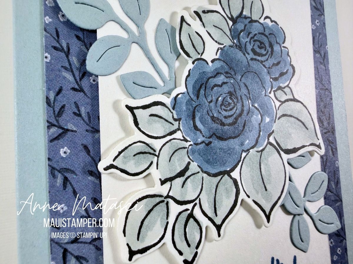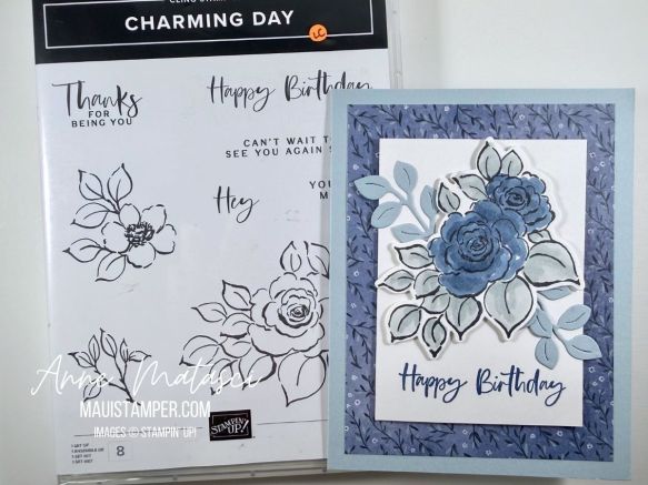- Accessories: Stamp Cut & Emboss Machine, Charming Day dies, Stampin’ Blends, True Blue DSP (Product of the Month), Stampin’ Dimensionals