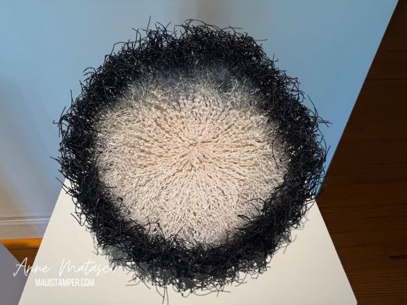 There are also 3 of these works, somewhat basket shaped. They are made of the white cord often used in gift-giving. Each shape is unique, but their structure is similar. I was mesmerized as I followed the individual cords composing each work.