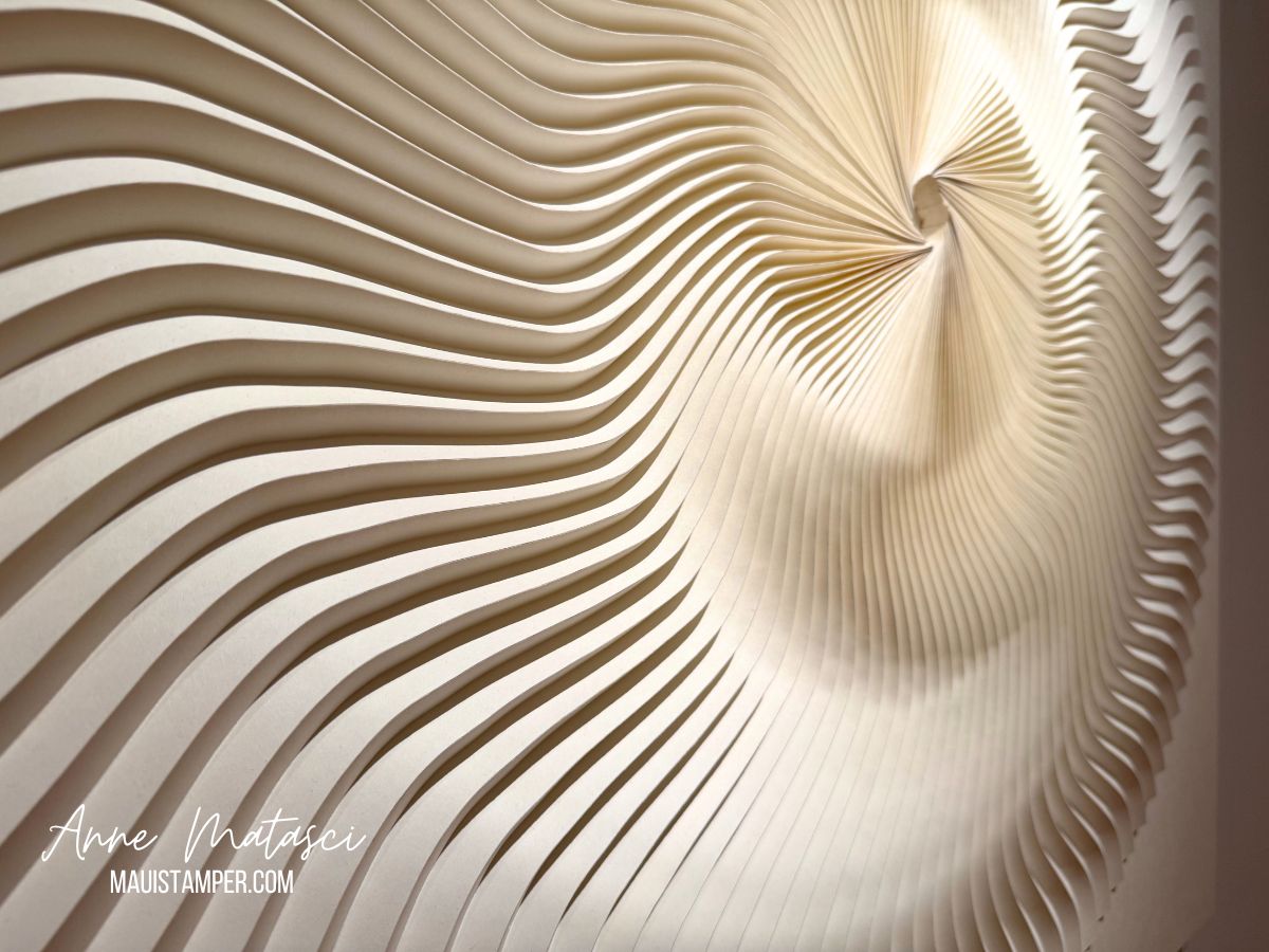 For my recent birthday, Mr. Maui Stamper took me to breakfast and then to an exhibit at the Schaefer Gallery at the Maui Arts and Cultural Center. It’s one of our favorite places to visit. The exhibitions are always extremely well curated, and the gallery is just the right size to explore without being overwhelmed. WASHI TRANSFORMED: NEW EXPRESSIONS IN JAPANESE PAPER took our breath away.