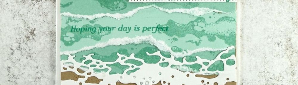 The technique is quite similar – tear the paper, alternate sides as you apply it, and finish with the Rolling Waves die cut. I changed the sentiment panel to a Stylish Shapes banner, and the color palette is Pool Party and Coastal Cabana instead of Cloud Cover and Lost Lagoon.