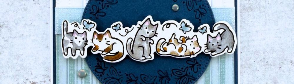 I love the patterns of lines, both horizontal and vertical, anchored by the Misty Moonlight circle in the middle. The patterns in the embossing folder lined up almost perfectly with the Designer Series Paper – what a lucky coincidence! Oh, and have I mentioned the kittens??? 😉