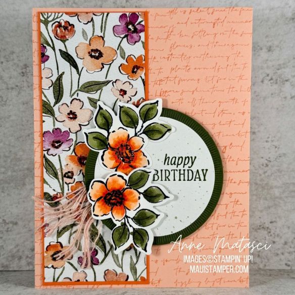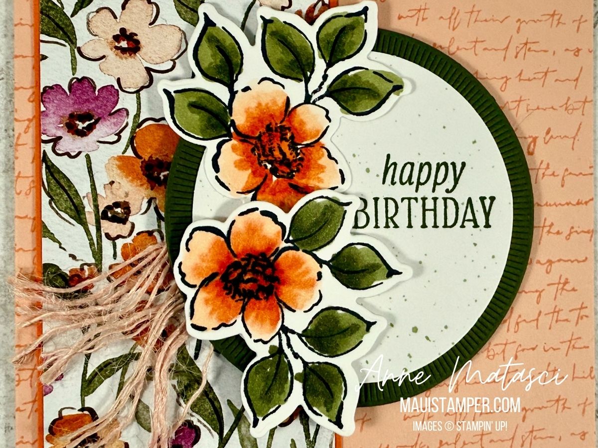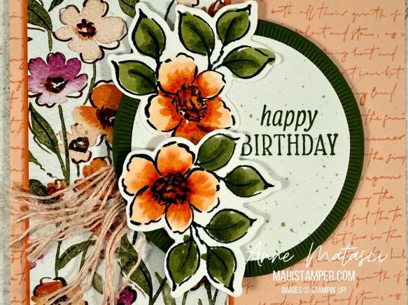 Accessories: Stamp Cut & Emboss Machine, Deckle Circle dies (retired), Florals in Bloom DSP, bone folder, paintbrush, dauber, Stampin’ Write Markers, Stampin’ Dimensionals