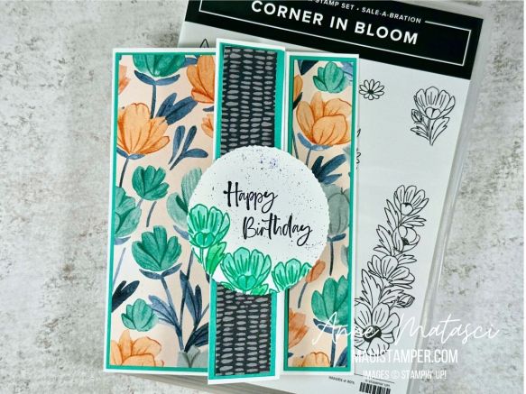 Here’s another version – almost the same, but a different DSP so a different color scheme. The Corner in Bloom stamps (from 2025 – Last Chance!) work perfectly with the Florals in Bloom DSP! And Florals in Bloom is on sale this month since it includes 25-27 In Colors. Win Win!