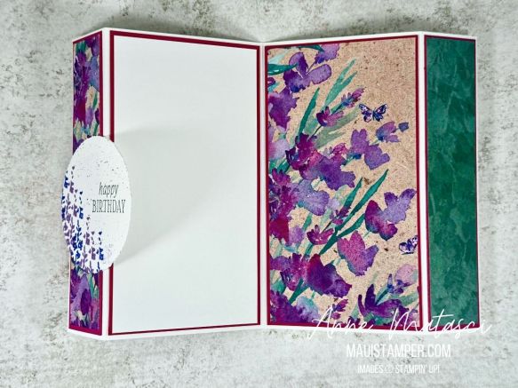 I pulled out the Perennial Lavender DSP and switched up the pattern layout. Not sure how I like the front with the deep Shaded Spruce panel, but I love the inside!