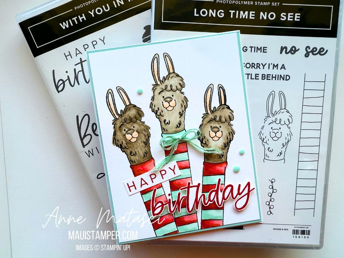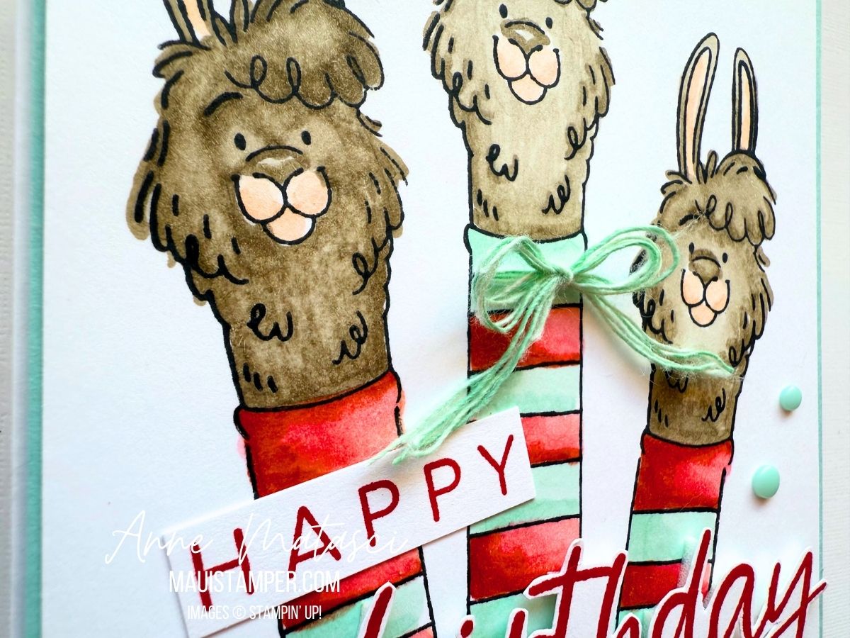 The only reason there isn’t a llama on my September DIY Calendar is that even without a neck it’s too tall. But there’s plenty of room on a card, especially a portrait-oriented card: check out my llamas from Long Time No See!