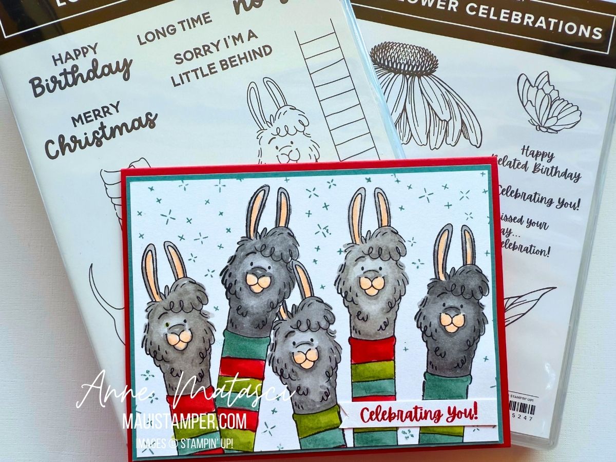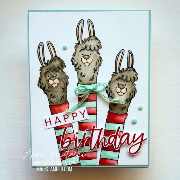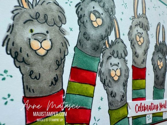 Either way, this card was colored with Stampin’ Blends much the way Tuesday’s card was. The llama-neck-sweaters have 3 colors, and if you look closely you’ll realize that some of the llamas are Smoky Slate and some are Gray Granite. Those funny starry background bits are from Spooky Halloween, because it was sitting on my desk begging to be included (Yes, the stamps talk to me, and I respond. And yes, that probably means I’m certifiable.)