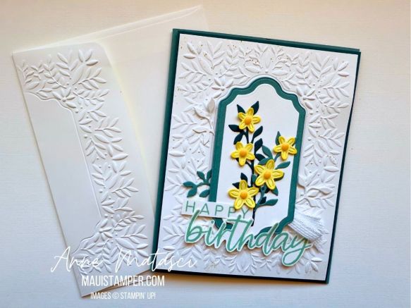 I had a moment of complete inspiration and ran the back flap of the envelope through the Stamp Cut and Emboss Machine with the embossing folder and let me tell you, it is GORGEOUS. Run, don’t walk to the Online Store for the Peaceful Greenery 3D Embossing Folder. Your SELF will thank you!