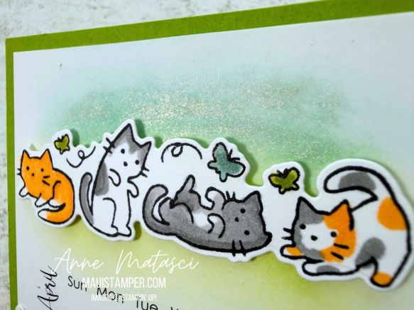I gave the kittens a bit of a wash so they had a nice place to roll, and I added a little Wink of Stella because, well, Wink of Stella. I made the butterflies the same colors as the wash (Granny Apple Green and Lost Lagoon) so it would look properly planned.