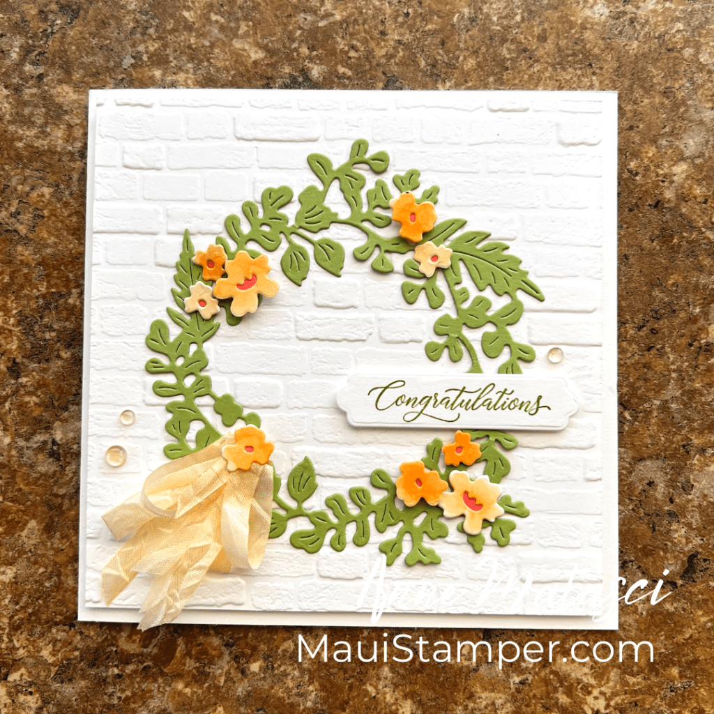 - Accessories: Stamp Cut & Emboss Machine, Gallery Blooms dies, Textured Notes dies, Delightful Wishes dies, Patterns of Friendship die, Perfectly Pears die, Linen Thread, Dauber, vellum, Stampin’ Dimensionals