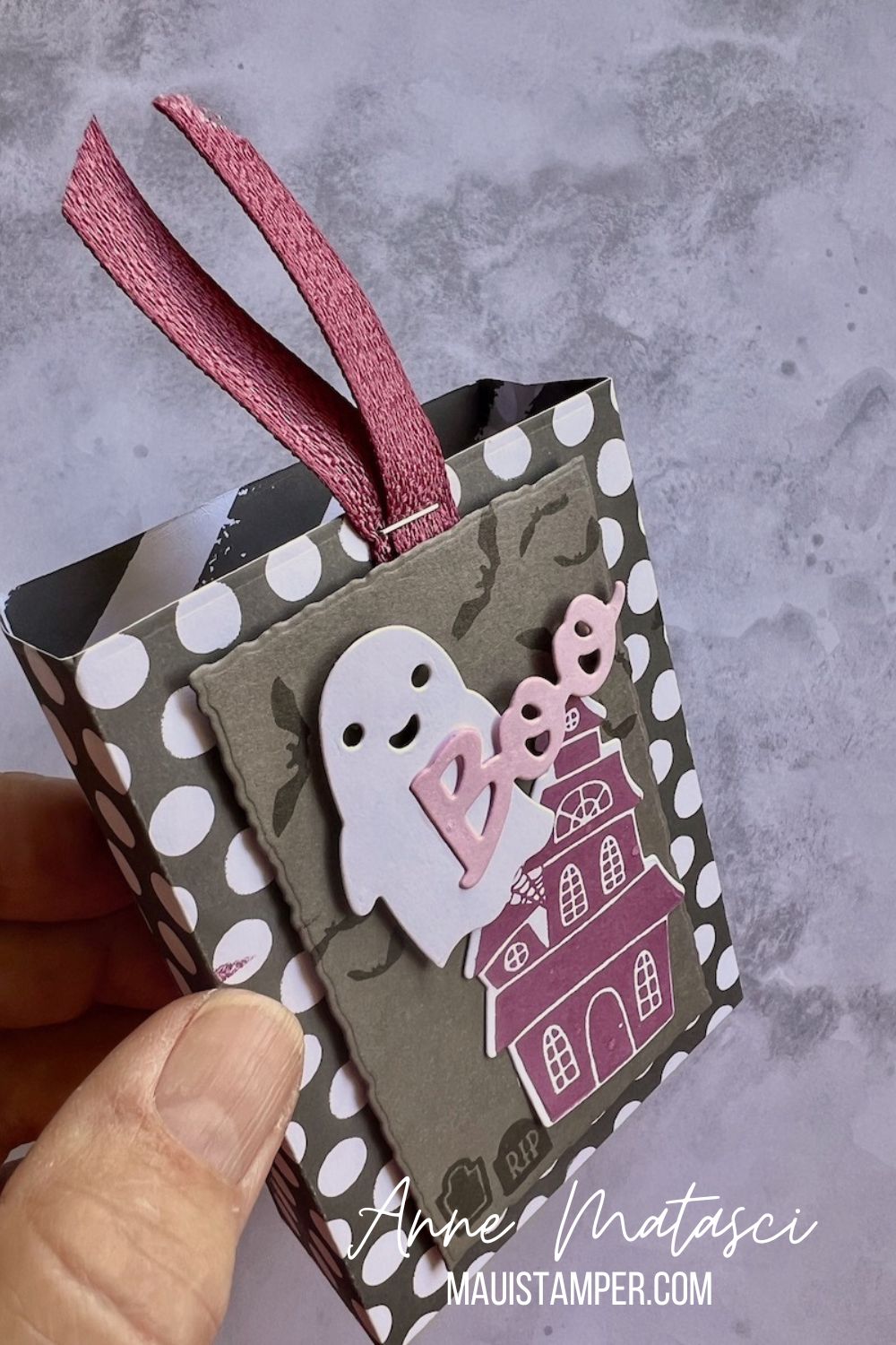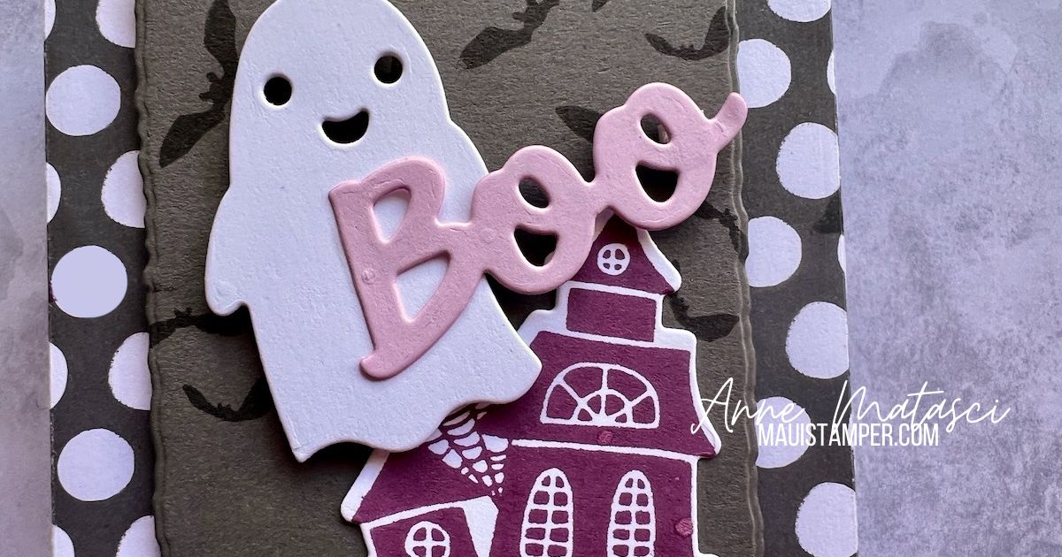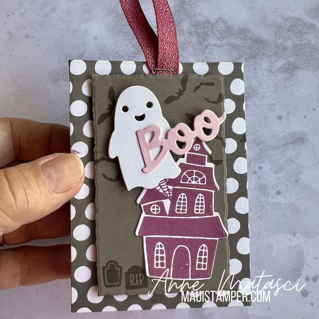 Accessories: Stamp Cut and Emboss Machine, Trick or Treat dies, Deckle Rectangle dies, 23-25 In Color DSP, Moody Mauve Textured Ribbon, Pebble Path Jute Trim, Stampin’ Dimensionals