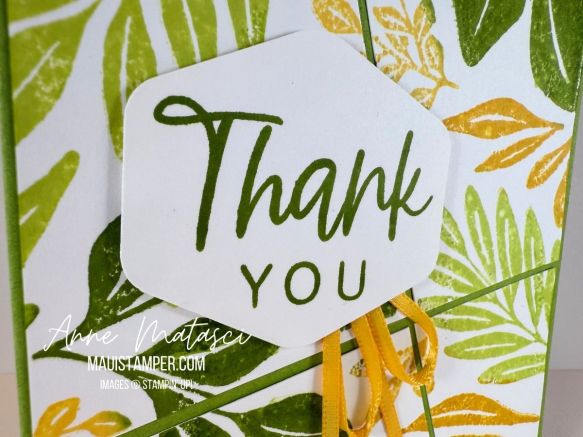 My tag is hand cut. I used a piece of chipboard from the back of a DSP package to make a pattern for the angles at the top. I snipped the corners with my Paper Snips and added the corner die cut from Spring Corners, along with a tiny 25-27 In Color Flat Pearl. A bow with the Mossy Meadow and Gold ribbon finishes it off!