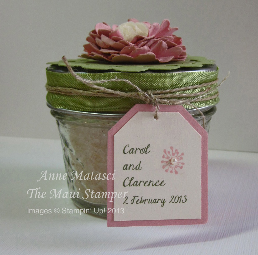 I had some of the retired cardstock we used for Carol’s weddding and I haven’t quite let go of that color combination, so I chose to share it with the club. I told them there should have been the teeniest tiniest pearls to line that beautiful neckline, but they had all been used up on wedding favors 🙂 They’re my friends; they understood.
