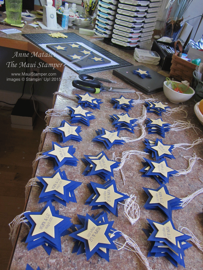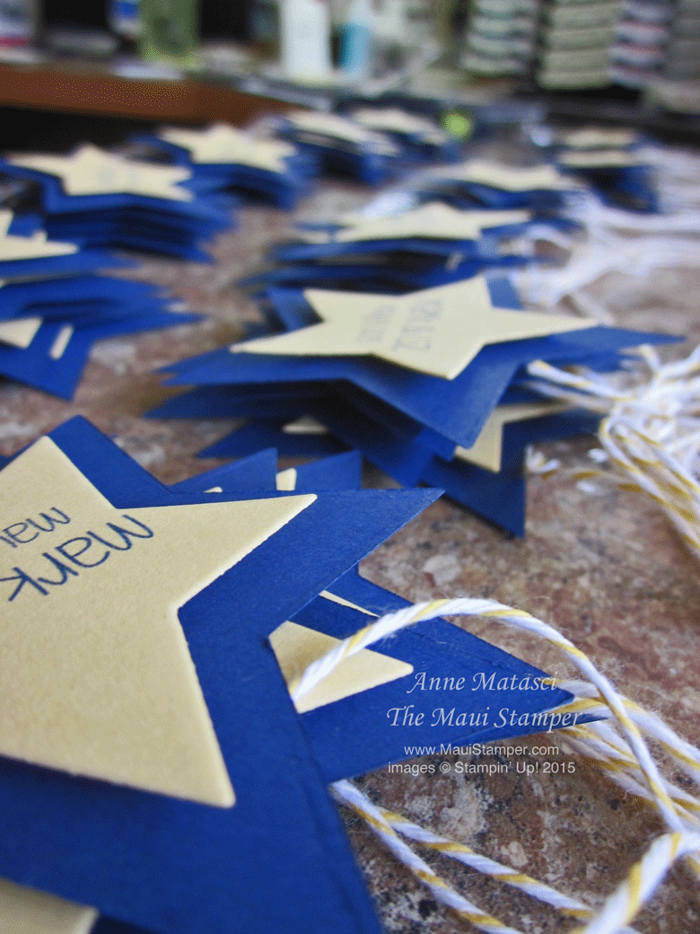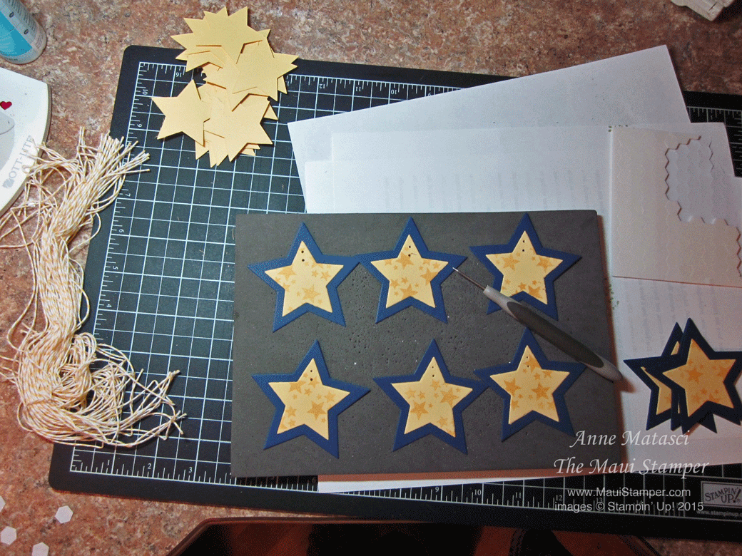 The first thing that I did was borrow another set of Star Framelits so that I would have two. By carefully planning and cutting the card stock into strips, I could cut eight stars at a time…two pieces of card stock at time. It’s not the recommended procedure, but if your shape is simple enough it works! Having 2 sets meant I could put 4 framelits through at a time.