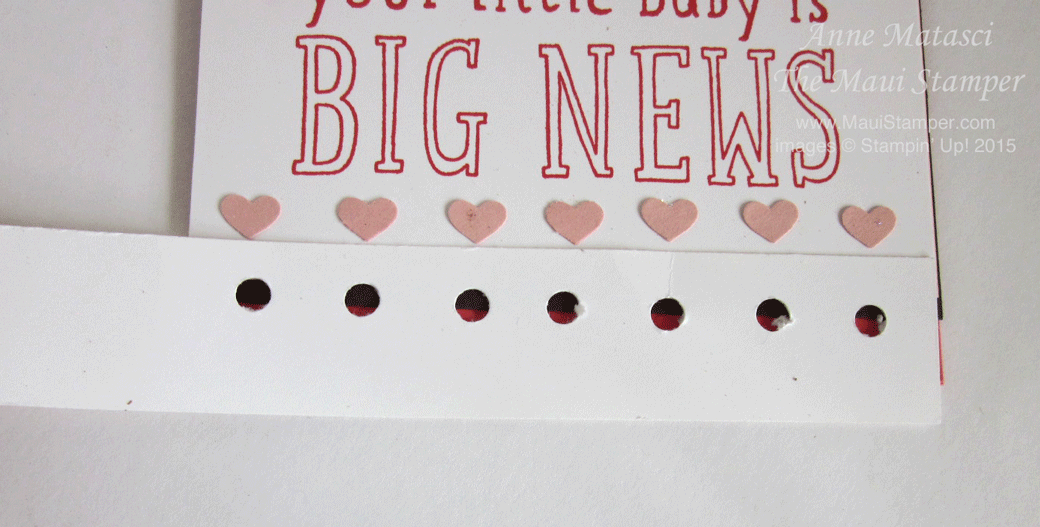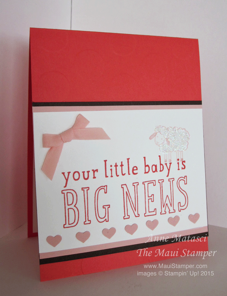 For this last sample, I used the same Calypso Coral and Blushing Bride combination but used the softer, more subtle Blushing Bride stripe for the DSP background. This one seems more like a baby card to me as a result.