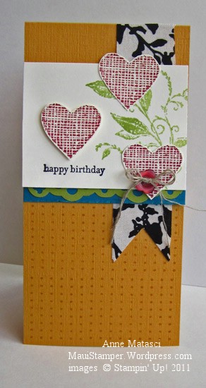 Mr. Maui Stamper likes to come by and see how “Stampinella” is doing. It always cracks me up when he calls me that – I’m not sure if it’s because I’m covered in ink, or because my studio looks like the wicked Stepsisters came crashing through, tossing bits of paper everywhere. What I really need are those cute little mice and birds from Cinderella that come in and finish her dress for her (they would clean up for me, thank you), but what I end up getting is an orange tabby with a shedding problem who wants to spread across my workspace.