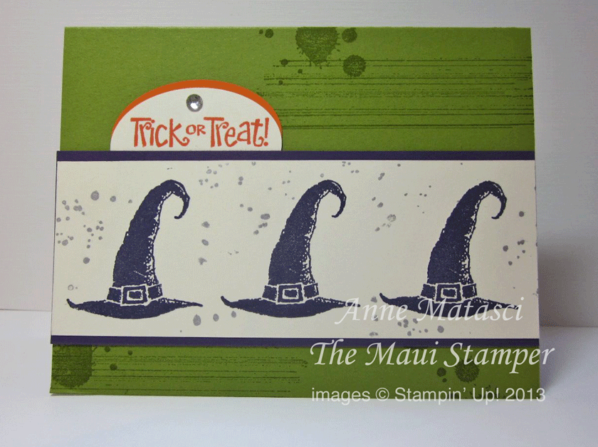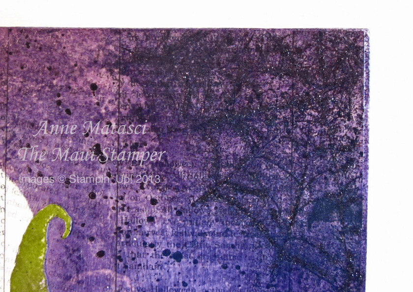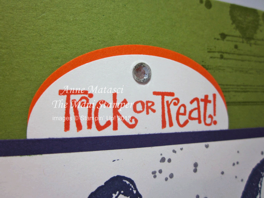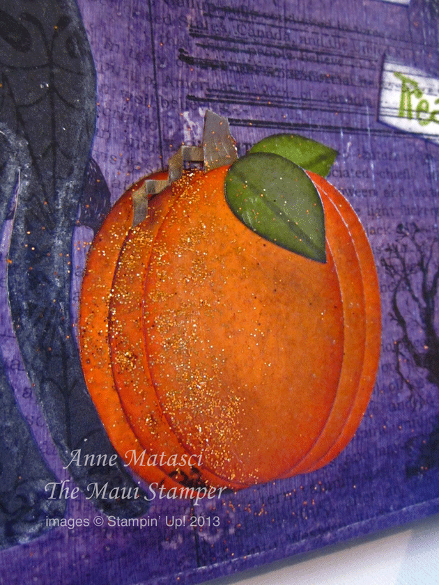 The pumpkin uses the Extra Large Oval punch, the Bird punch (the wing is the leaf) and LOTS of sponging. The orange glitter is kind of everywhere, but at least it shows in the photo! And btw, Mr. Maui Stamper has seen this project and neither he nor I have mentioned said glitter. If you don’t acknowledge it, it doesn’t exist.