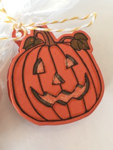 I made these little guys with the Seasonal Chums stamps and Seasonal Tags framelit dies. I discovered that stamping with Basic Black and using the matching Stampin’ Write marker to highlight the lines on the pumpkin was enough. The stems and leaves were quick to color and a little Wink of Stella gave Jack a proper gleam. Toe Bod Butts (Candy Corn, if you didn’t grow up in my house) fits perfectly in our 2″x8″ cello bags.