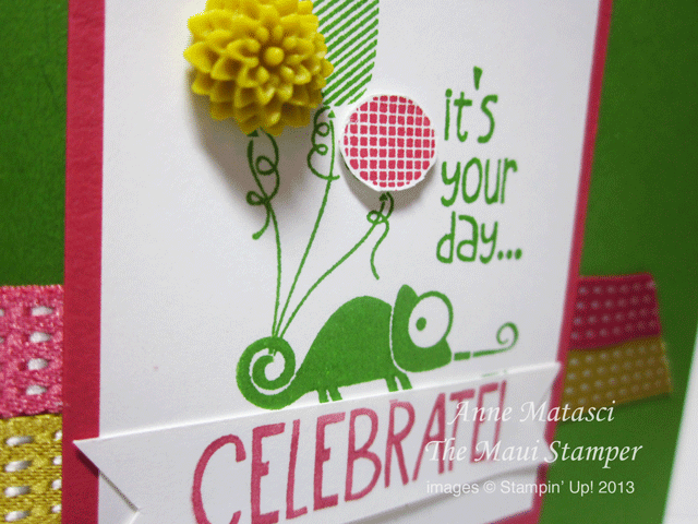 I inked the image twice – once with Gumball Green (my new fave green) and once with Primrose Petals. I cut the Primrose Petals image up to get the “Celebrate” flag and the accent balloon, then added the Summer Starfruit Dahlia with a glue dot.