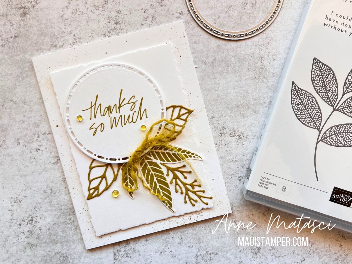 I’ve chosen different elements from Changing Leaves and switched up the layout for a completely different feeling in this monochromatic card. I’m still having fun pulling apart my Jute Trim, though!
