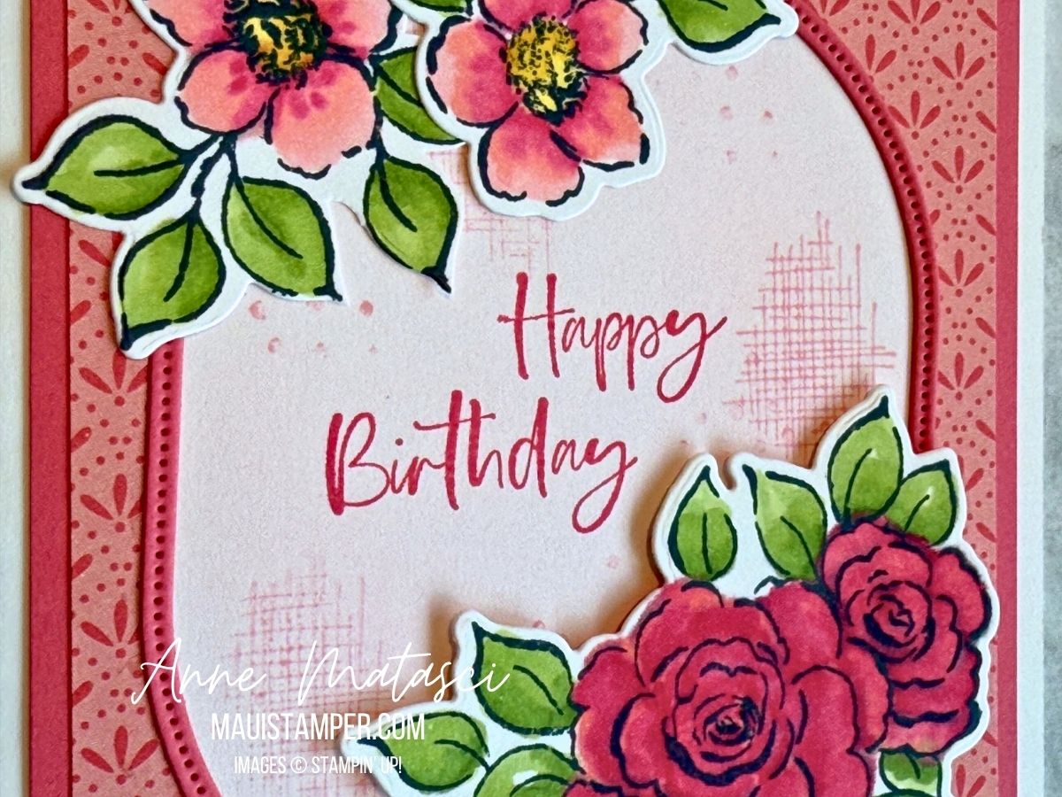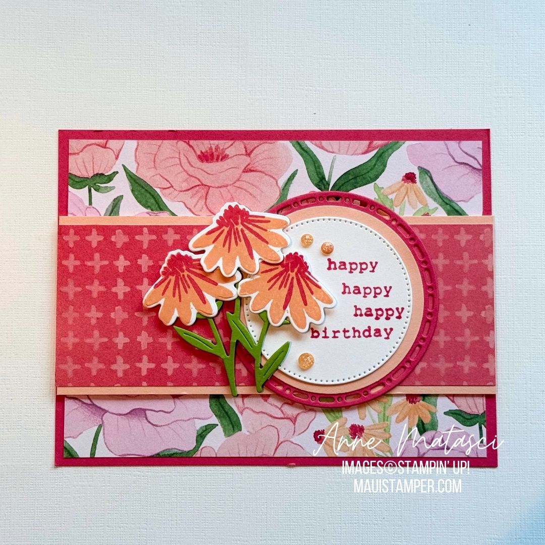 - Accessories: Stamp Cut + Emboss Machine, Spotlight on Nature dies, Charming Day dies, 2 3/8” circle punch, Floral Charm DSP, Stampin’ Blends, Stampin’ Write Marker, Petal Pink Braided Trim, Stampin’ Dimensionals