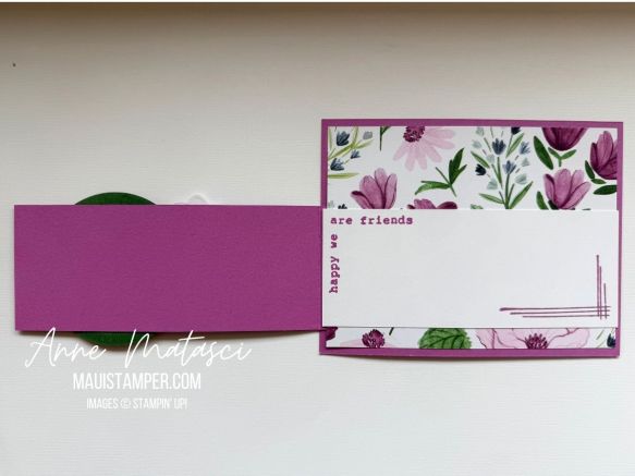 I added a few speckles to the Basic White circle with a Stampin’ Write Marker – just flick the brush against the cap for a light spatter. And that Petal Pink trim unravels quite easily, keeping some wave in the strands for a soft accent.