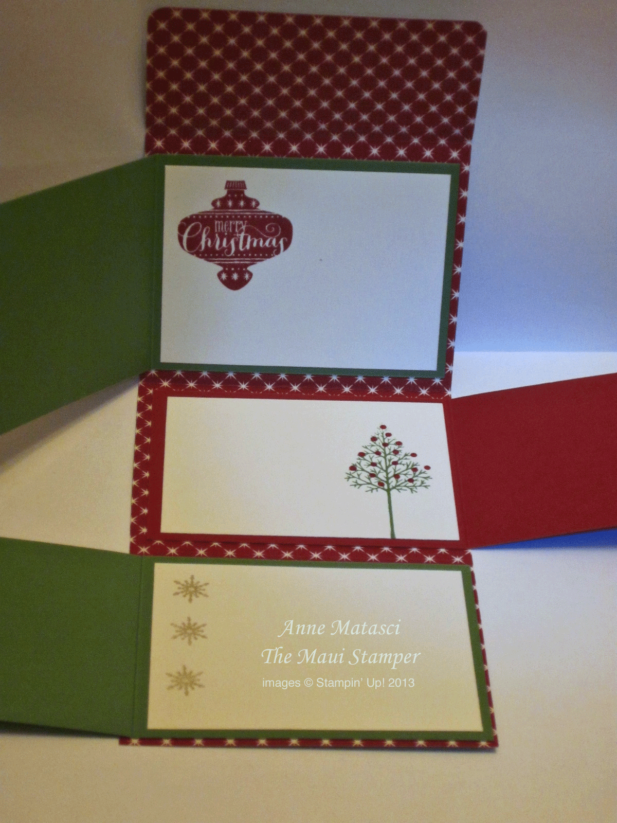 When you slide off the belly band, it flips open to reveal three panels. (Please IGNORE the Designer Series Paper – it’s retired – we’re dealing in concepts here!) The stamps are from the Hostess Set Warmth and Wonder from the Holiday catalog.