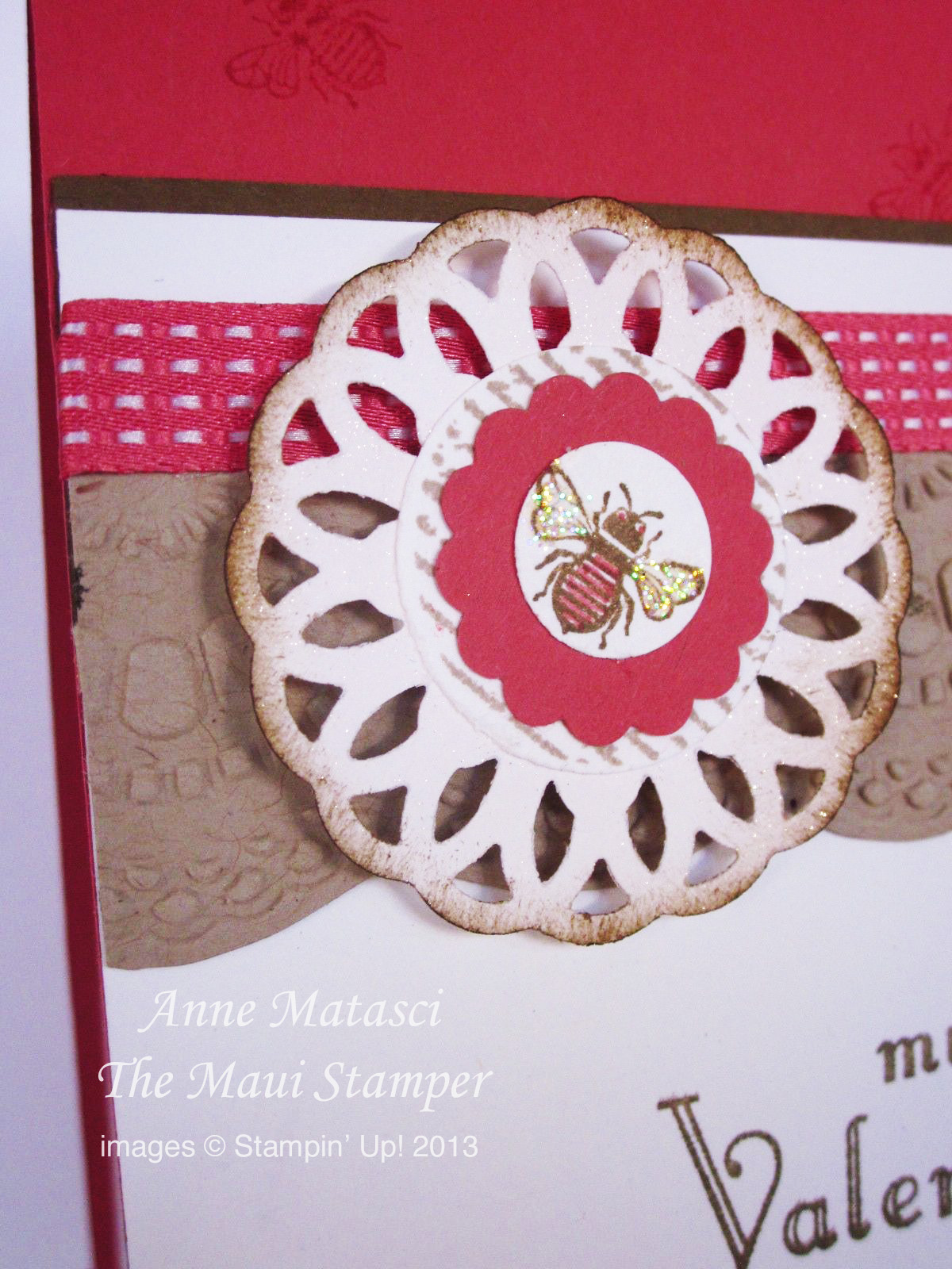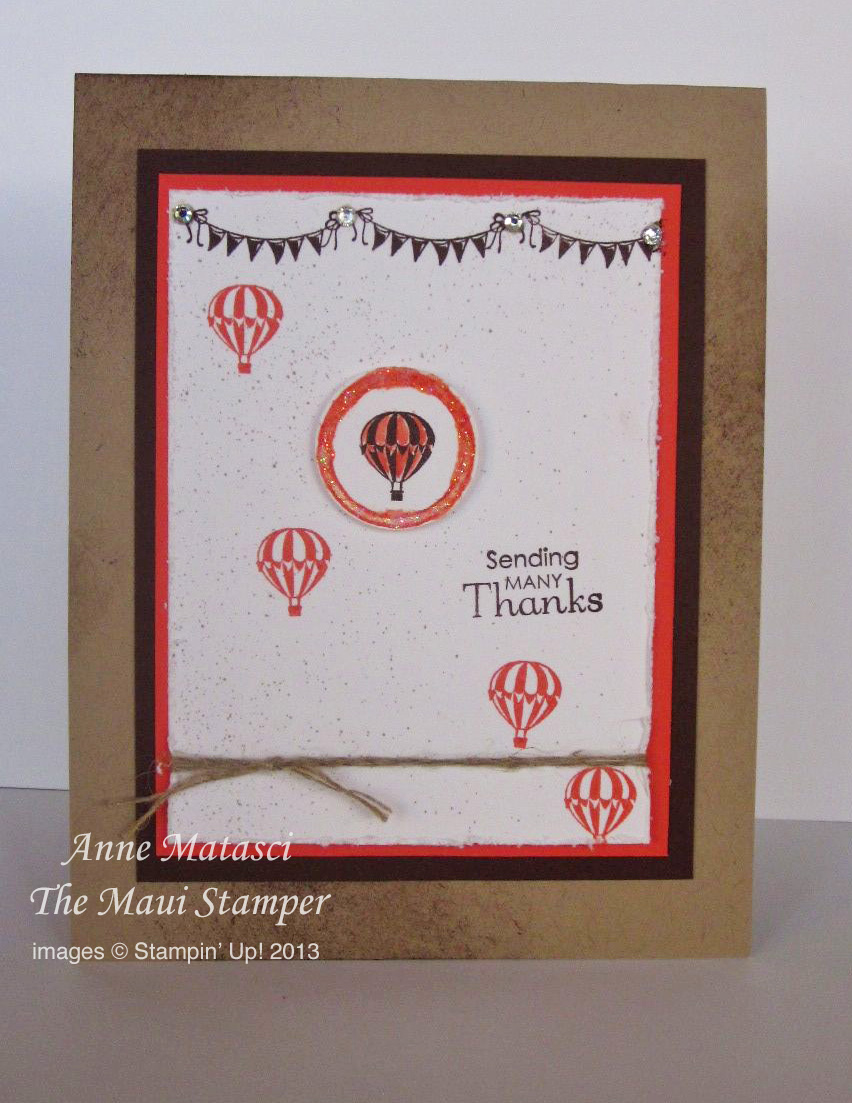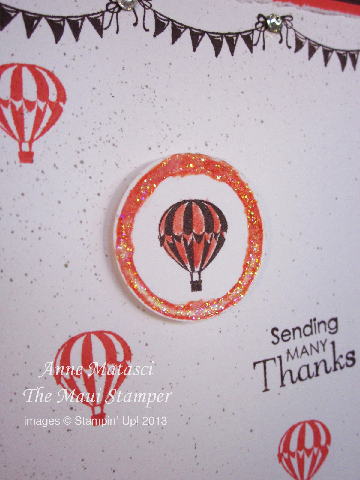 You know, I kept going with that “More is More” kinda thing here. The little hot air balloons just naturally floated across the page, but then the Color Spritzer wanted in, and the Crumb Cake card base wanted a little bit of spongin’ texture, and before I knew it there were jewels and Dazzling Details and we were off to the races! Kinda fun, though…