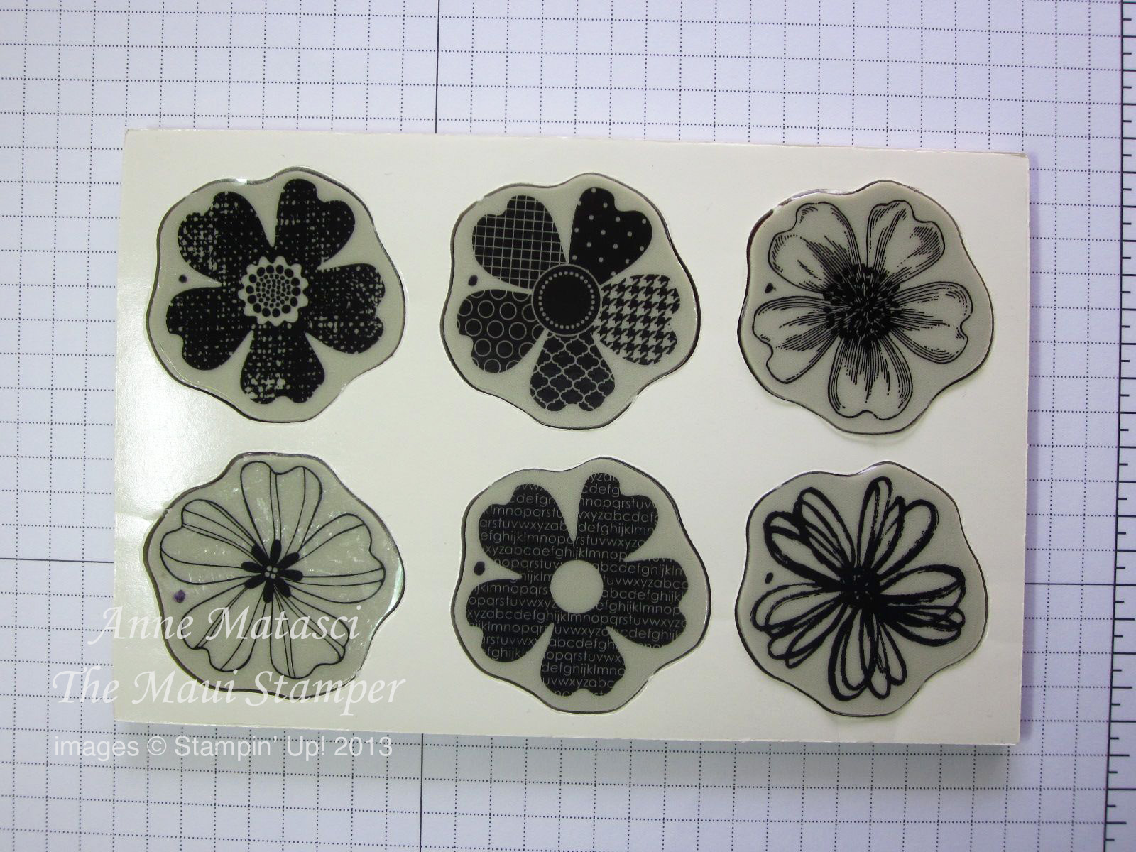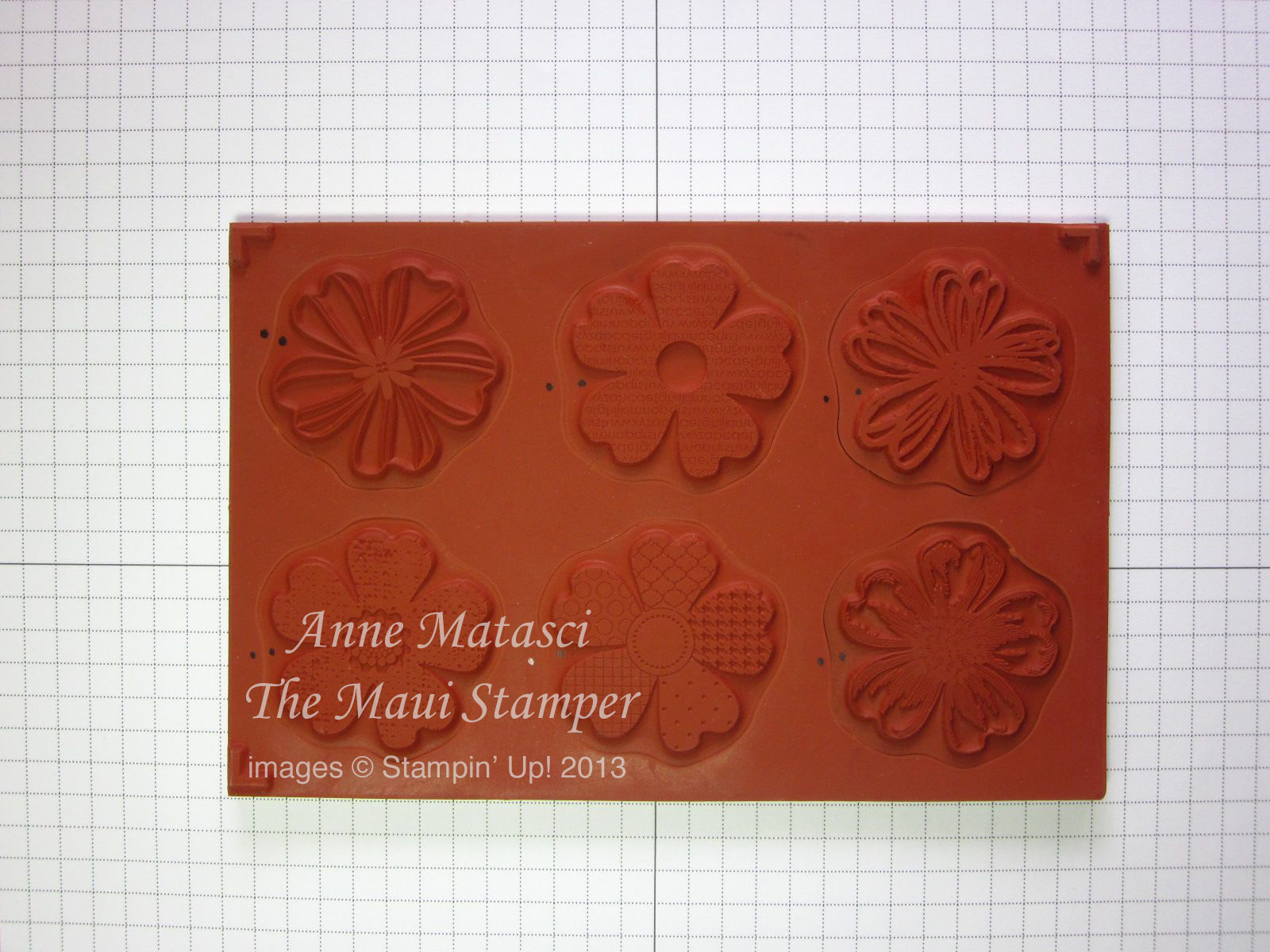 Stampin' Up! Maui Stamper How to Punch the Flower Shop PansyI went ahead and marked the dot on the “sticker side” of my stamps as well so that I could see it through the clear block.  That allows me to be sure a row of pansies are stamped in the same orientation each time if I want to punch out a whole bunch (oh, say 60 or so!)  Be careful here – when you flip the stamp over, be sure you don’t reverse it and put the dot on the opposite side!  Check the rubbah!