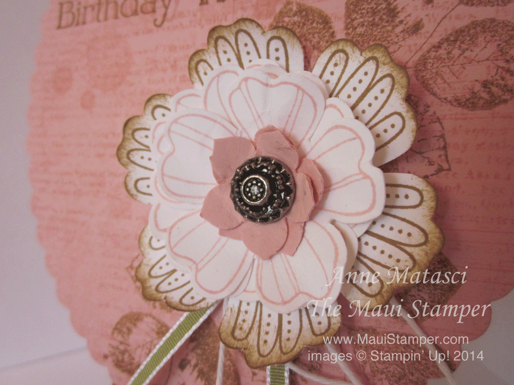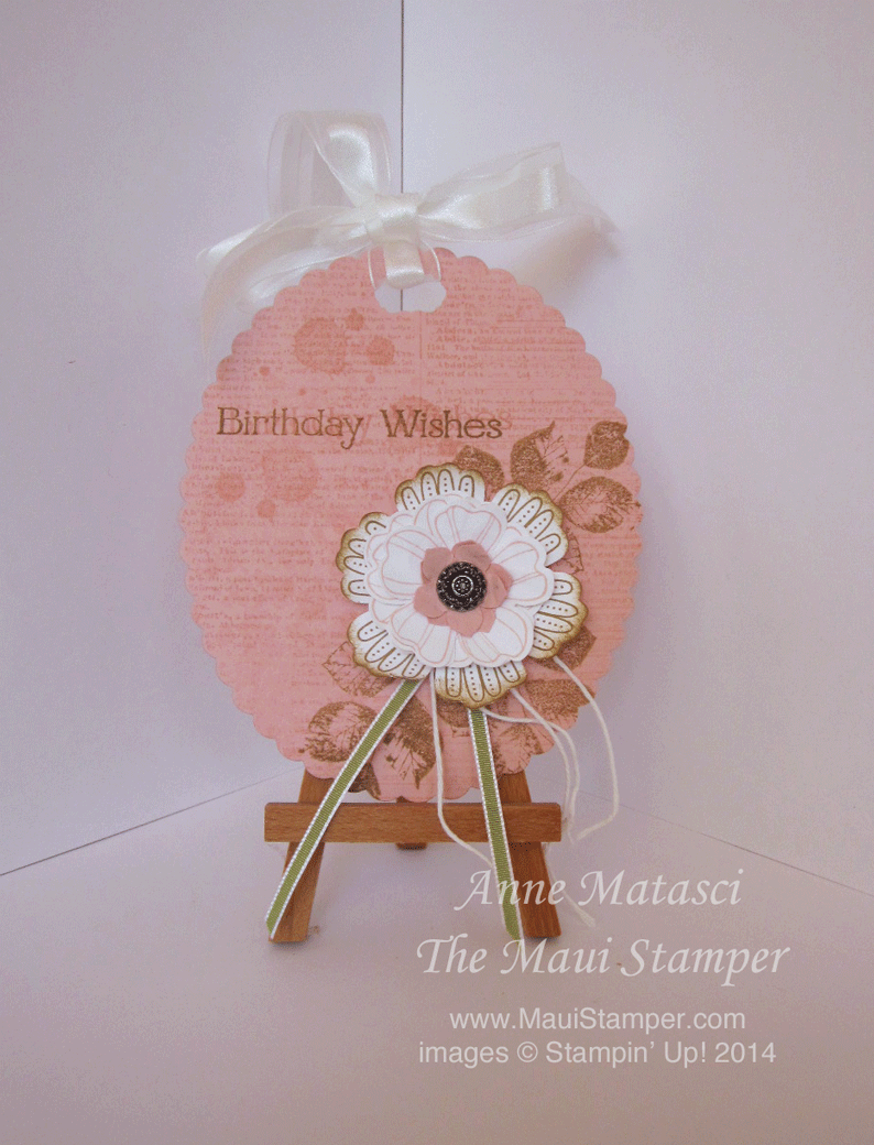 Maui Stamper Blush Blossom Floral TagThe flower is punched and stacked.  I used a birthday greeting on this one, but it would be a beautiful bridal or baby shower tag too.  Have fun with it!