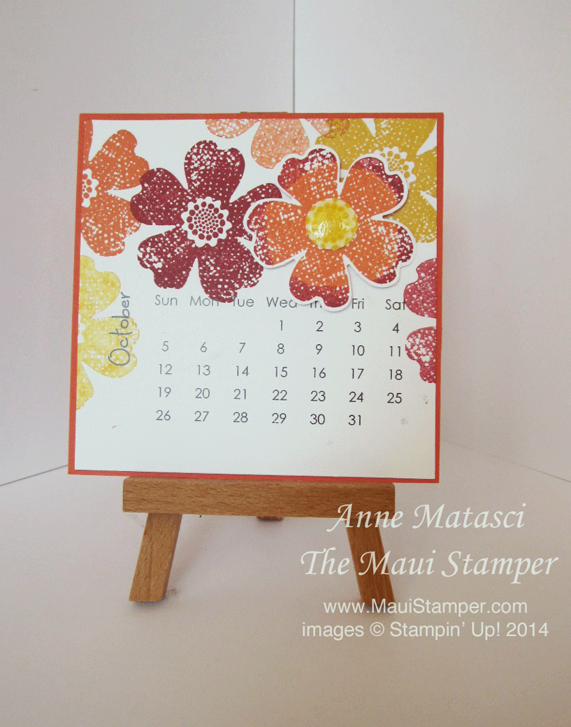 Maui Stamper October 2014 DIY Easel CalendarWhen I first order Flower Shop (AND the Pansy punch, of course – this kind of thing goes without saying) I discovered that Stampin’ Up! had pulled a bit of a fast one on us.  The flower – and the punched image – are NOT symmetrical.  You can’t just stamp that flower and punch it out any ol’ which-a-way.  I developed a solution and posted a mini-tutorial: you can check it out HERE.