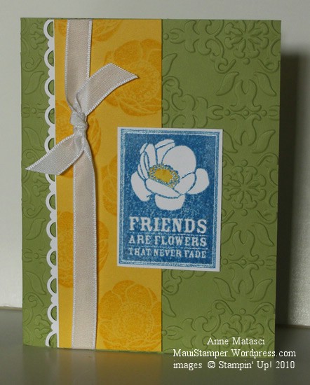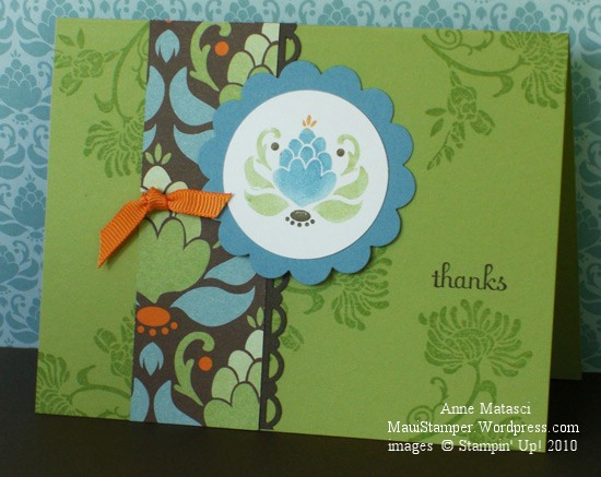 I love that artichokey-pineappley-image and I especially love seeing it repeated in the paper and the stamp. What a perfect example of Stampin’ Up! coordination: paper, stamps, colors…everything works together. Back in my BSU (Before-Stampin’-Up!) days I would have gone crazy trying to put something like this together. Oh, and I really love the font used for Fabulous Phrases.