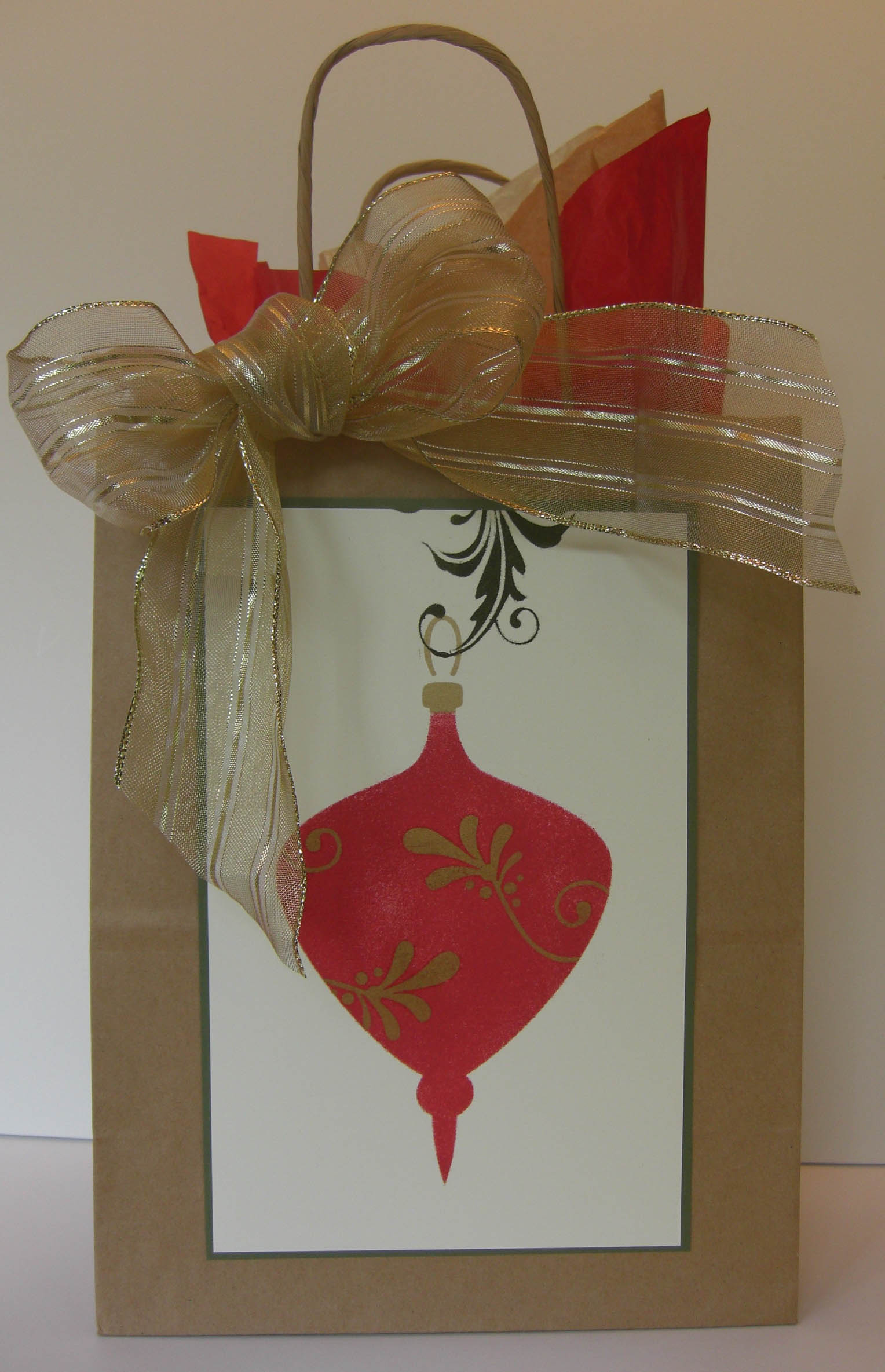 - Purchased kraft bag, gold wire ribbon, and tissue