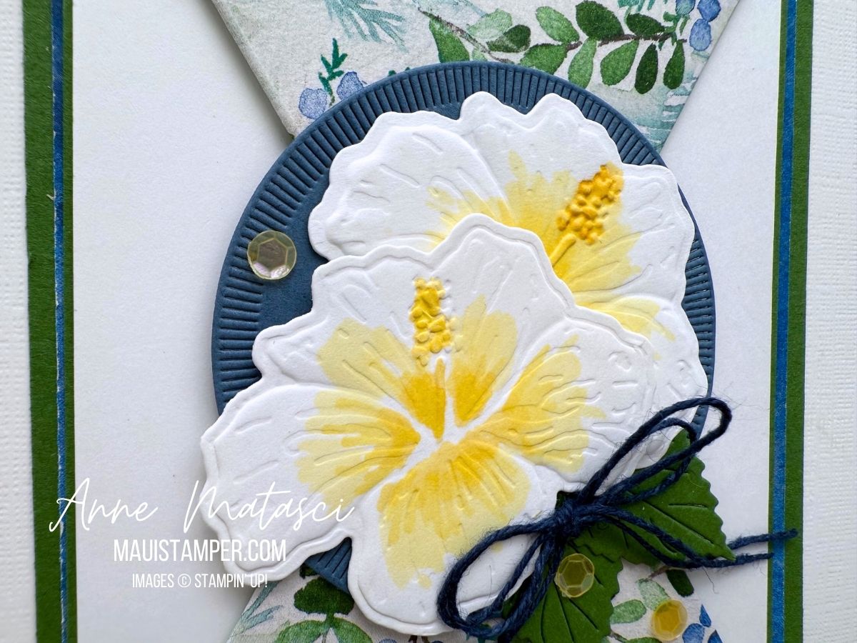 I chose a different die from Spotlight on Nature. I doubled up the gorgeous Natural Tones Linen thread for a simple bow, and added a few shiny sequins for sparkle. And I really, really love the Happy Hibiscus Hybrid Embossing Folder. 💛